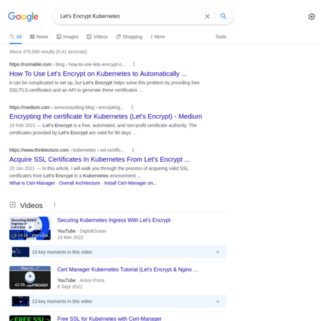 So we searched Google and DuckDuckGo for "Let's Encrypt Kubernetes" and to our surprise, cert-manager.io does not feature among the top search results.